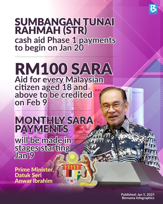 Meanwhile, Anwar said the SARA assistance for hardcore poor recipients will be credited on Jan 9, while the first phase of the Sumbangan Tunai Rahmah (STR) cash contribution, amounting to up to RM500, will be credited on Jan 20.