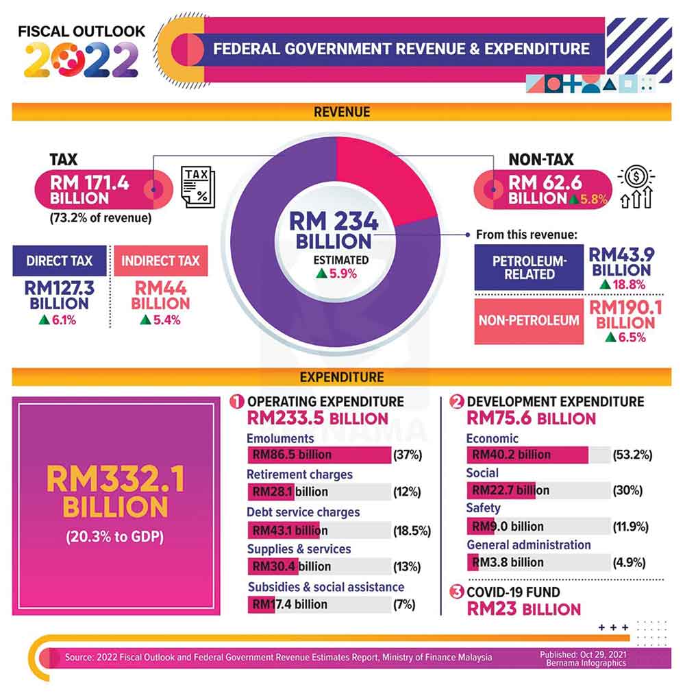 Let me start by acknowledging that this budget is the biggest ever in Malaysia’s history; a whopping RM332.1 billion. This amount is divided into Opex of RM233.5 billion, Devex of RM75.6 billion and RM23 billion of Covid-19 Fund. To support this biggest ever budget the government is projecting a robust GDP growth of 5.5 to 6.5% for 2022.