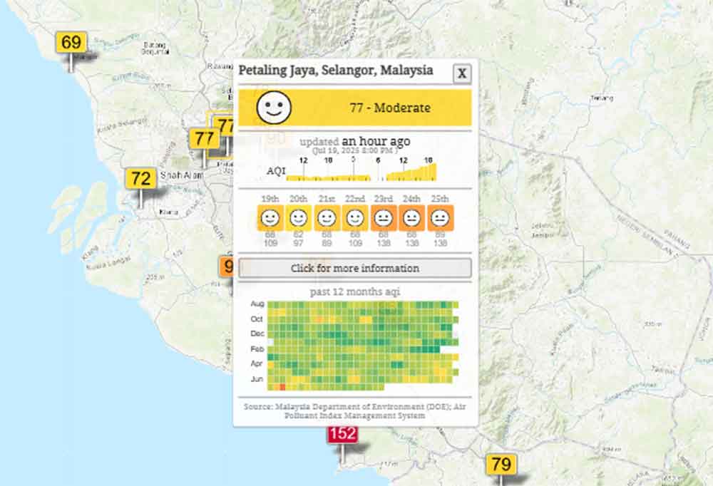 Meanwhile, 60 other areas recorded moderate API levels, including Banting, Selangor (94), Cheras, Kuala Lumpur (89), Nilai, Negeri Sembilan (86), Kota Bharu, Kelantan (85), Kuala Terengganu, Terengganu (84) and Sungai Petani, Kedah (83).