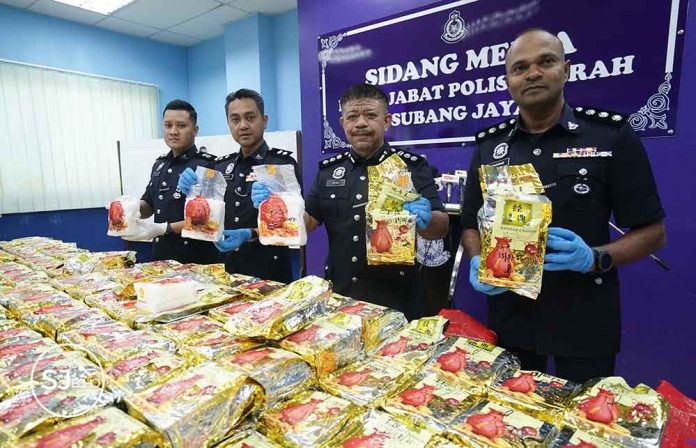 “Upon closer examination, our team discovered four gunny sacks in the back seat of the car, stuffed with 78 neatly packed ‘Chinese Tea’ pouches,” Subang Jaya OCPD ACP Wan Azlan Wan Mamat said at a press conference.