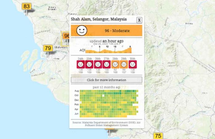 API readings have dropped in several areas previously affected, with Petaling Jaya (83), Klang (80), Banting (81) and Johan Setia (88) showing improvement from highs of 150. Shah Alam recorded a moderate reading of 90, while Kuala Selangor remains in the unhealthy range at 126.