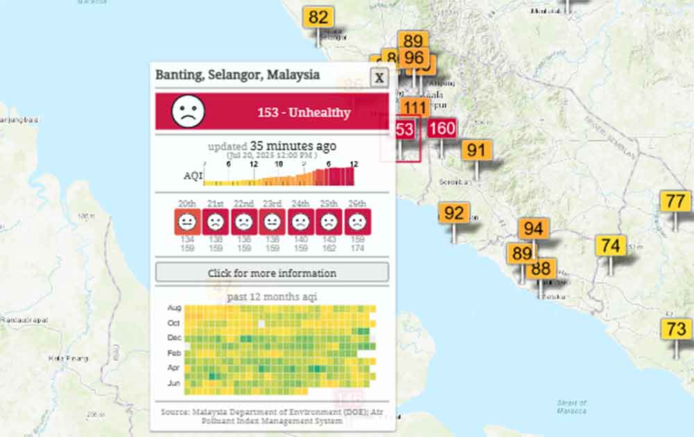 Also recording unhealthy air quality were Port Dickson, Negeri Sembilan with an API reading of 153 and Banting, Selangor (151).